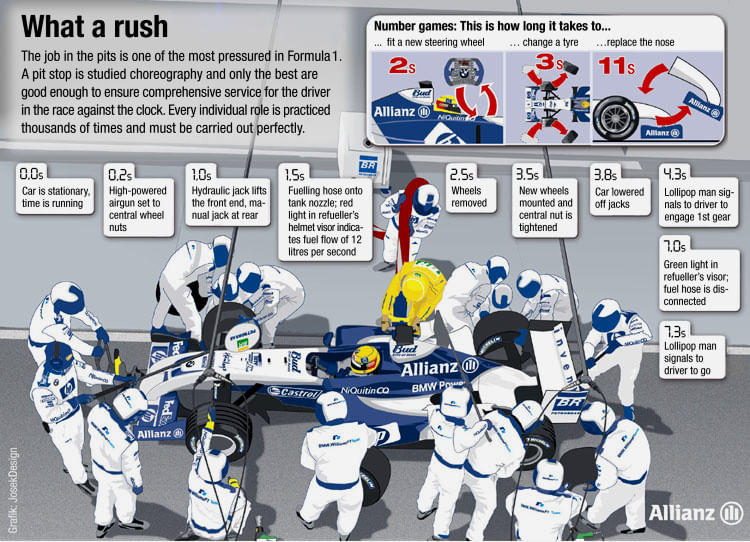 On tracks with debris or rubbish you often see mechanics removing this from the car’s air intakes during a stop, ensuring radiator efficiency is not compromised. And there is always a mechanic on stand-by at the back of the car with a power-operated engine starter, ready for instant use if the car stalls. When they have finished their work the mechanics step back and raise their hands. It is the responsibility of the lollypop man to control the car’s departure from the pit, ensuring no other cars are passing in the pit lane, though some teams now use semi-automated traffic light systems instead of the lollipop. Such is the skill of mechanics that routine tyre stops can be over in well under five seconds.