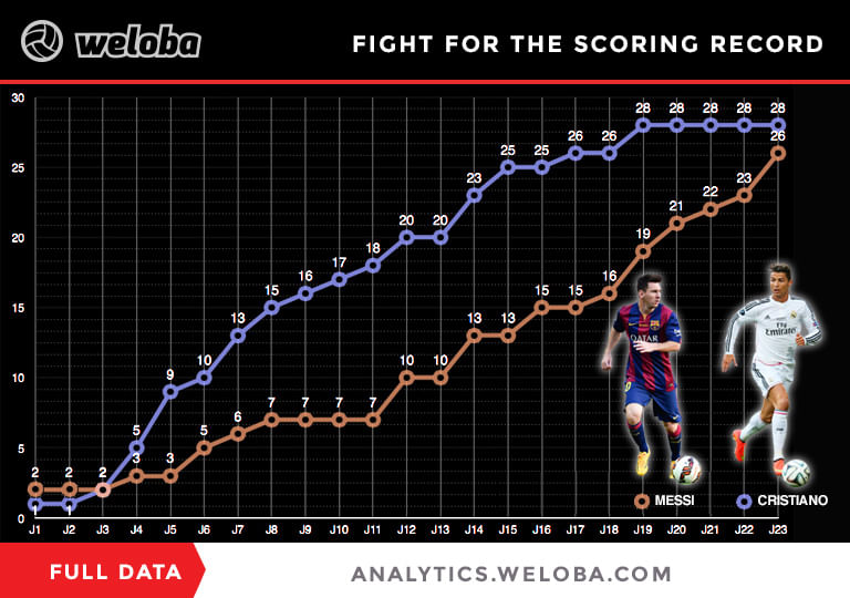 Then Madrid striker started an impressive goalscoring streak (9 games in a row scoring). After 12 matches, he had achieved 10 goals more (20) than Messi (10). On the day 15, the difference was the highest this season: 12 goals, as Cristiano had scored 25 and Messi 13.