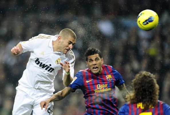 Karim Benzema (L) vies with Barcelona’s Brazilian defender Dani Alves (R) during the “El clasico” Spanish League football match Real Madrid against Barcelona at the Santiago Bernabeu stadium in Madrid on December 10, 2011. (JAVIER SORIANO/AFP/Getty Images)