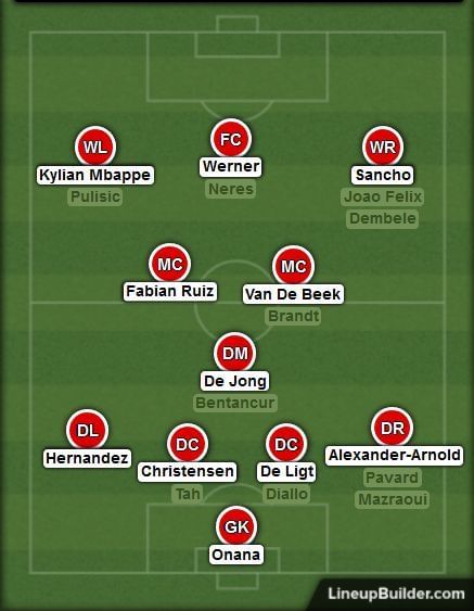 At the age of 23, Andre Onana is Ajax's rock at the back and will likely continue to play that position at least for the near future. The back four ahead of him would include a World Cup winner Lucas Hernandez (23) at left-back, Champions League winner Trent Alexander-Arnold (20) at right-back, and league champions Andreas Christensen (23) and Matthijs De Ligt (20) as the two centre-backs. Their backups in Jonathan Tah (23), Abdou Diallo (23), Benjamin Pavard (23), and Noussair Mazraoui (21) are no slouches either.