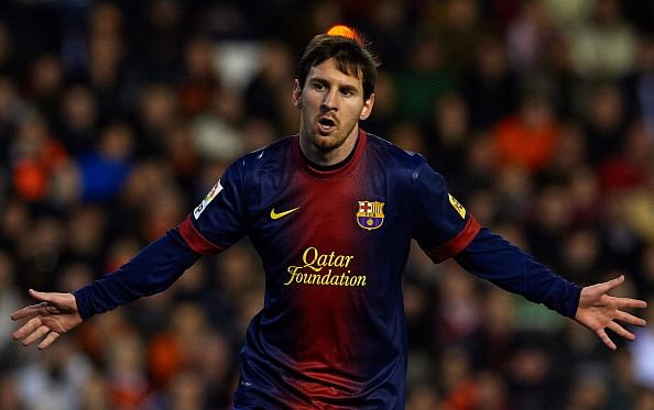 Lionel Messi celebrates after scoring during the La Liga match between Valencia and Barcelona on February 3, 2013 in Valencia, Spain. (Getty Images)