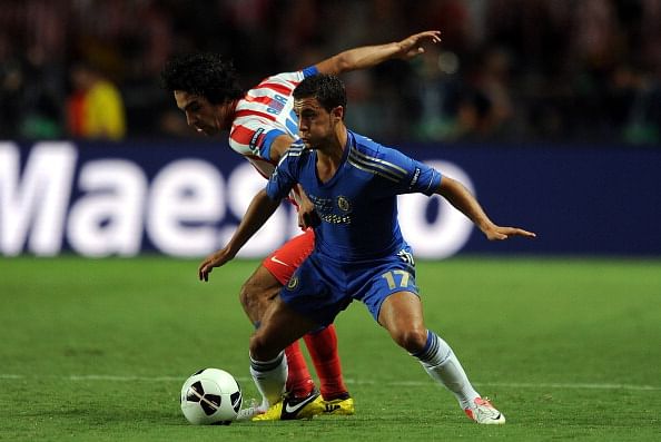 MONACO – AUGUST 31: Eden Hazard of Chelsea in action with Arda Turan of Atletico Madrid during the UEFA Super Cup match between Chelsea and Atletico Madrid at Louis II Stadium on August 31, 2012 in Monaco, Monaco. (Photo by Chris Brunskill/Getty Images)