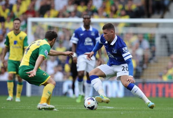 Ross Barkley of Everton attempts to get past Wes Hoolihan of Norwich City during the Barclays Premier League match between Norwich City and Everton at Carrow Road on August 17, 2013 in Norwich, England. (Photo by Tony Marshall/Getty Images)