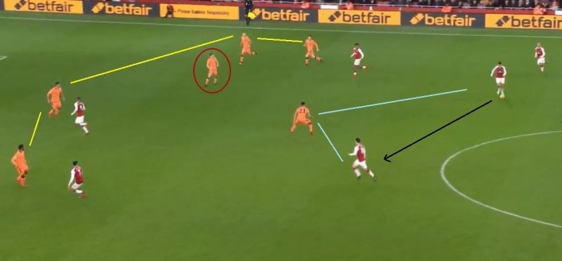 A couple of minutes after Liverpool scored their second, Arsenal’s passing started to click as the Gunners wasted no time before storming forward to attack the Reds' porous defence. Let us look at two important frames moments before the goal to find out what exactly happened.