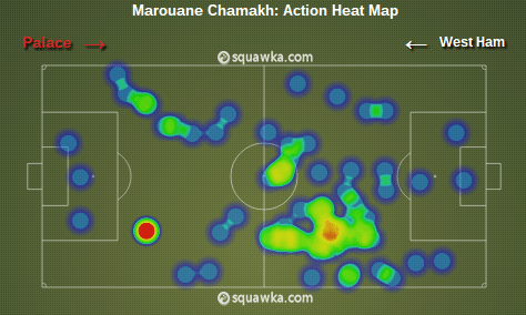 His Heat Map was even more impressive, showing just how much ground he covered during the 84 minutes he was on the pitch. Chamakh drifted out to the right wing but also got in behind West Ham’s defenders, giving plenty of penetration to Palace’s attacks. He also dropped deeper throughout to help out the midfield. His work-rate was fantastic and his goal was everything he deserved.