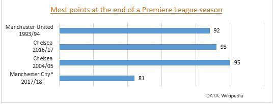 From the remaining fixtures, United and Spurs ought to be tough competition and they may drop points against the two. Averaging at 2.7 points per game in game week 30, they could definitely hit the 100-point mark and set a new Premiere League record.