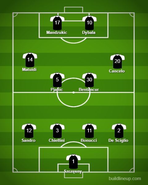 Juventus: Wojciech Szczęsny, Mattia De Sciglio, Leonardo Bonucci, Giorgio Chiellini, Alex Sandro, Miralem Pjanic, Rodrigo Bentancur, Blaise Matuidi, Joao Cancelo, Paulo Dybala, Mario Mandzukic.