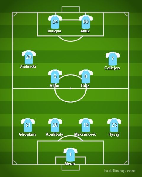 Napoli: Alex Meret, Elseif Hysaj, Nikola Maksimovic, Kalidou Koulibaly, Faouzi Ghoulam, Allan, Fabian Ruiz, Jose Callejon, Piotr Zielinski, Lorenzo Insigne, Arkadiusz Milik.