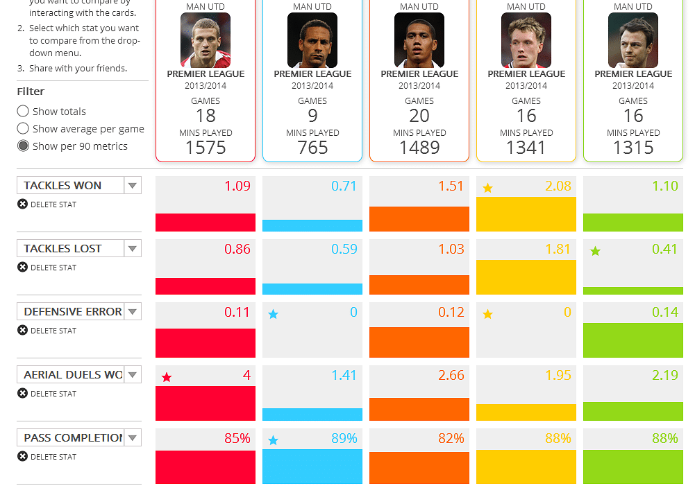Compared to his fellow defenders in regards to the performance indicators that are most crucial to playing a more aggressive role at the back against clubs such as Palace, Vidic is not the exceptional individual many may assume him to be. Jonny Evans, though slightly more error-prone, is more dependable in every other measure, while Smalling and Jones—their stats somewhat distorted by runs at right-back and midfield—are almost on par with their more senior teammate.