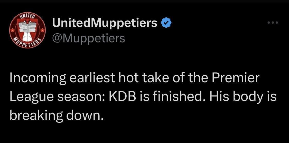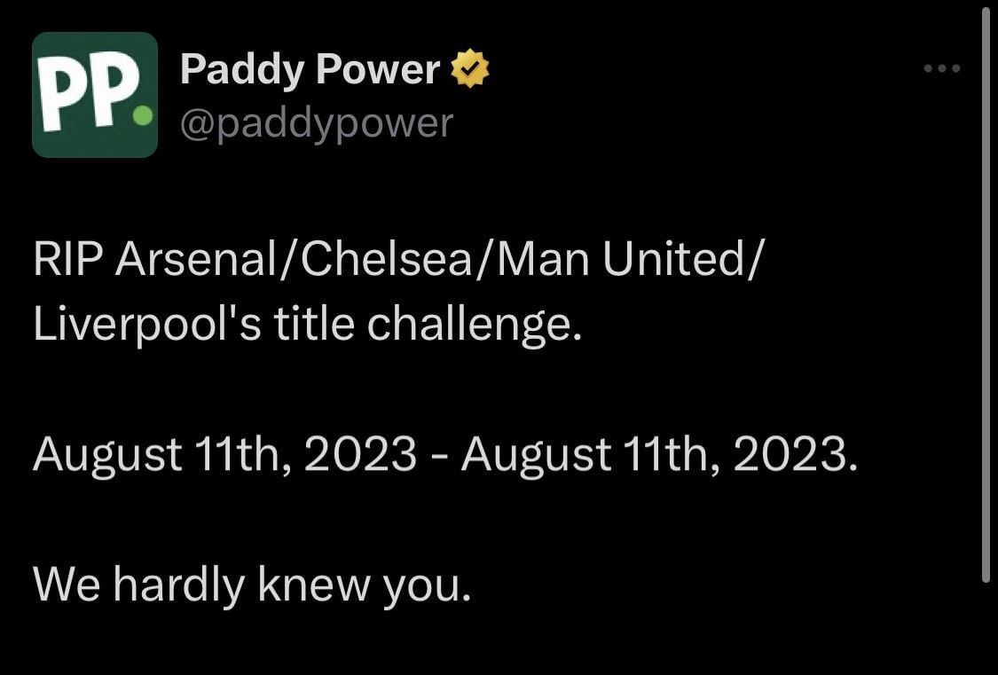 "RIP Arsenal/Chelsea/Man United/Liverpool's title challenge. August 11th, 2023 - August 11th, 2023. We hardly knew you."