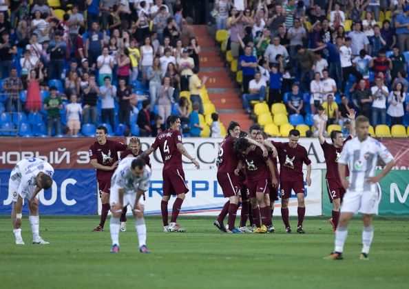 Players of FC Rubin Kazan celebrate after their victory over PFC CSKA Moscow in the Russian Football League Championship match between FC Rubin Kazan and PFC CSKA Moscow