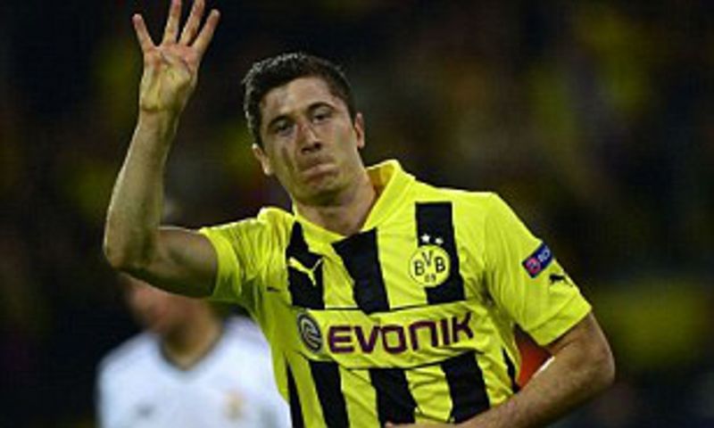Robert Lewandowski became the first player from Poland and the 66th different player in the Champions League to score a hat-trick when he scored all four goals in Borussia Dortmund's 4-1 win over Real Madrid in the first leg of their 2012-13 semifinal in Dortmund.