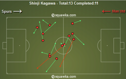 Having played very well in the last match, Kagawa got another run at the No. 10 role with Rooney playing as the forward yet again. This time around he was completely anonymous without making any attacking pass at all. Compared to Leverkusen, Tottenham played a much higher line. What this meant was that the space between the defence and midfield, that Kagawa tends to exploit, was non-existent. Add in the physical superiority of the Tottenham midfield and Kagawa had to drop deep to collect passes but never was he able to carry the ball higher up the pitch. His situation was worsened by the lack of mobility of Tom Cleverly who was the complete opposite of how well Giggs played in his role last match. The result was that Kagawa was soon shunted to the left where he remained a mere passive supporter for Evra and Rooney.