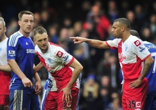 Chelsea defender John Terry (L) and Queens Park Rangers defender Anton Ferdinand during a match at Stamford Bridge in west London on April 29, 2012. Terry’s lawyers asked Tuesday for the racial abuse case against the former England football captain to be dismissed from court, calling it “weak and tenuous.”