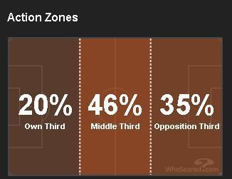 As the picture suggests, it is clear that all meaningful action for the current Premier League champions takes place through the middle, where Fernandinho ideally does all the defensive contributions in terms of interceptions, blocks, and aerial duel wins.