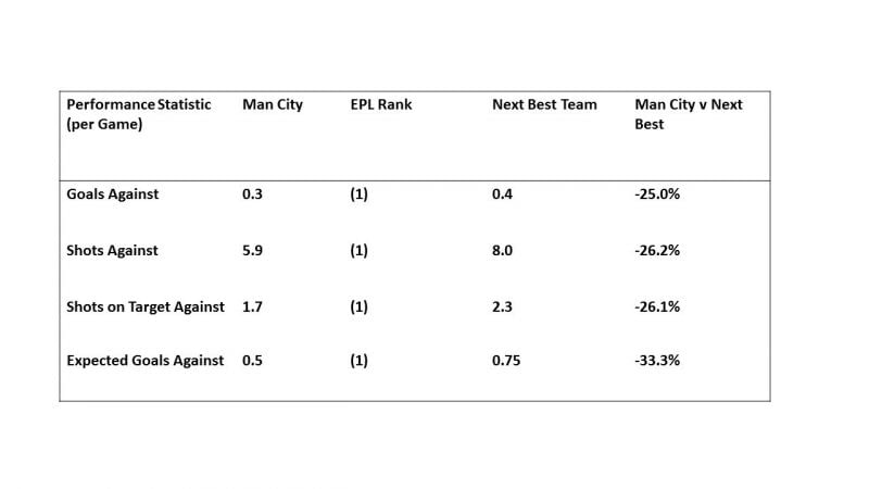 City are ranked first on each of the main measures - least goals conceded, least shots against, least shots on target against and least expected goals conceded. Again, what is significant is just how much better City are than the next best team in each metric - ranging from 25% to 33%. This is not just a marginal differential.