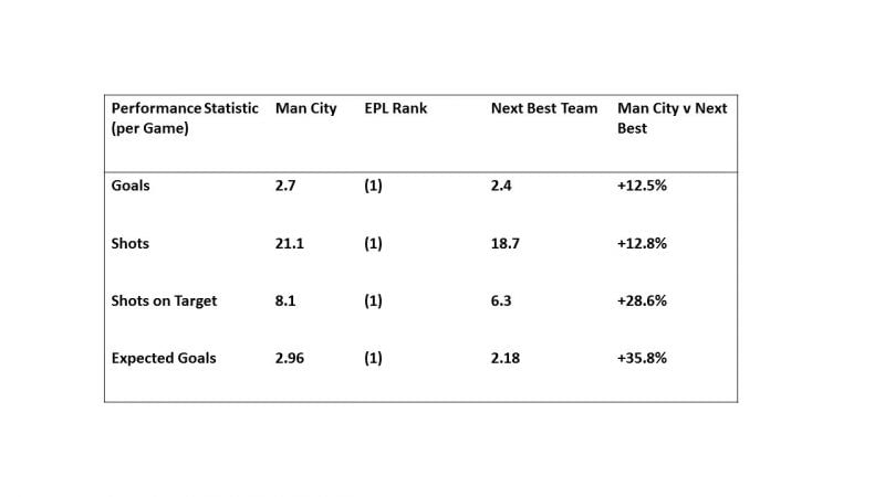 Consider how City are performing against the rest of the league in terms of attacking statistics. City rank first in the EPL on every measure that matters. They have scored the most goals, had the most shots, had the most shots on target and have a higher expected goals total than anyone else in the league.