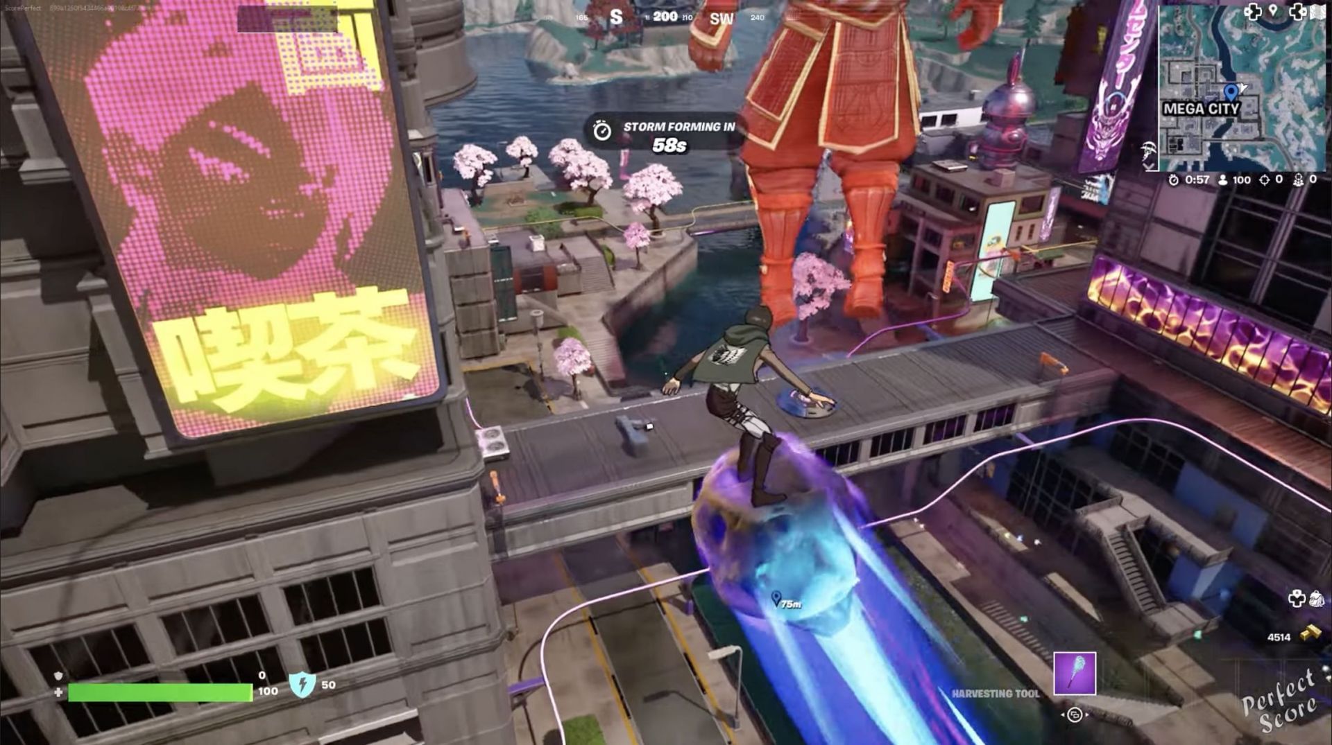 In the harbor just outside Mega City, there's a boat. It has ziplines going to it and a launchpad. There's also a launchpad in Mega City that you can take to get there. The ship has cargo containers on it, and you can then use the ziplines or launchpad to leave and head to the following location.