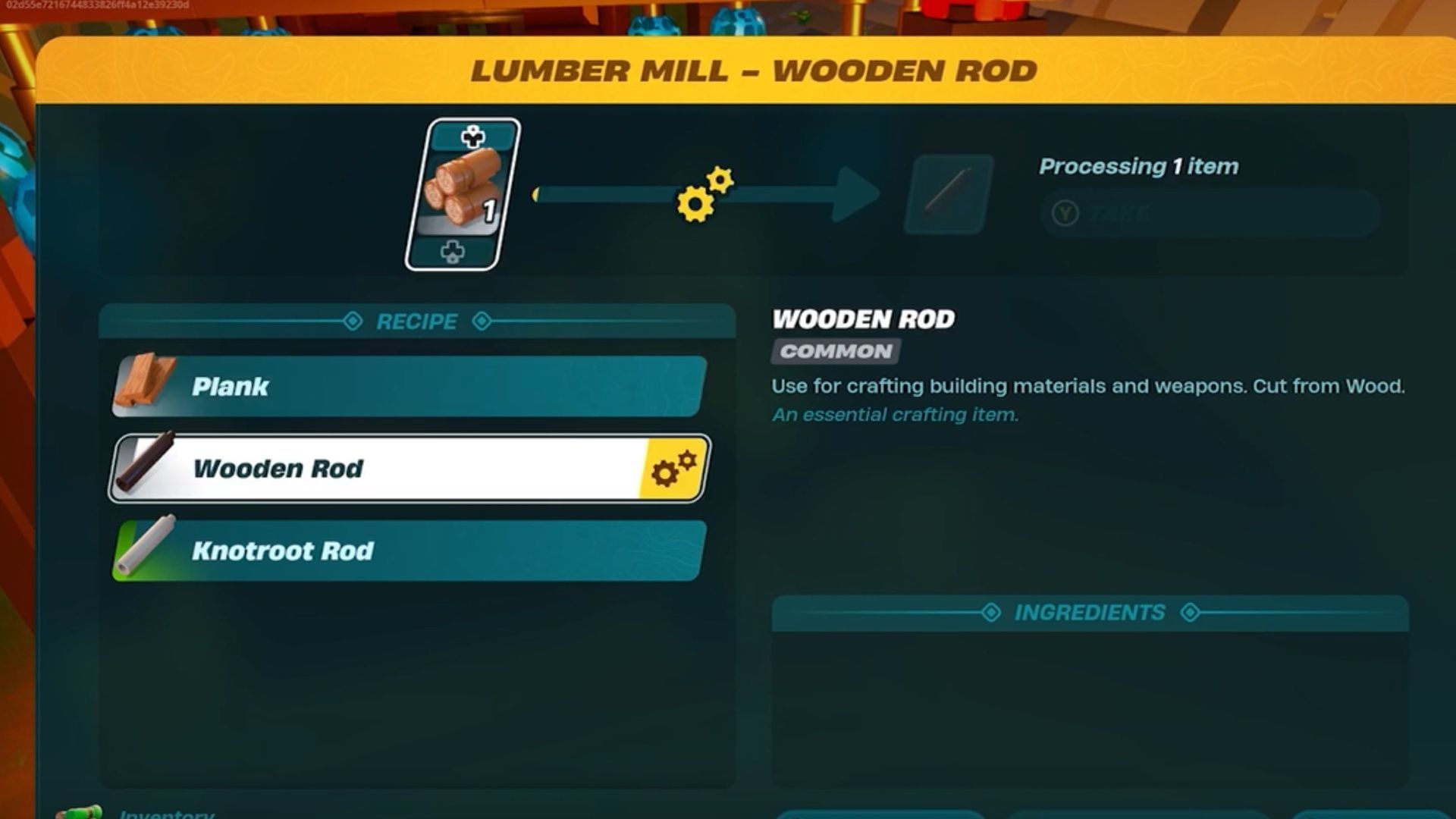 After obtaining the Lumber Mill, gather a piece of wood and return to your base. Interact with the Lumber Mill to find the recipe for crafting the Wooden Rod. Select the recipe, hold down the required action button, and you'll successfully craft the Wooden Rod.