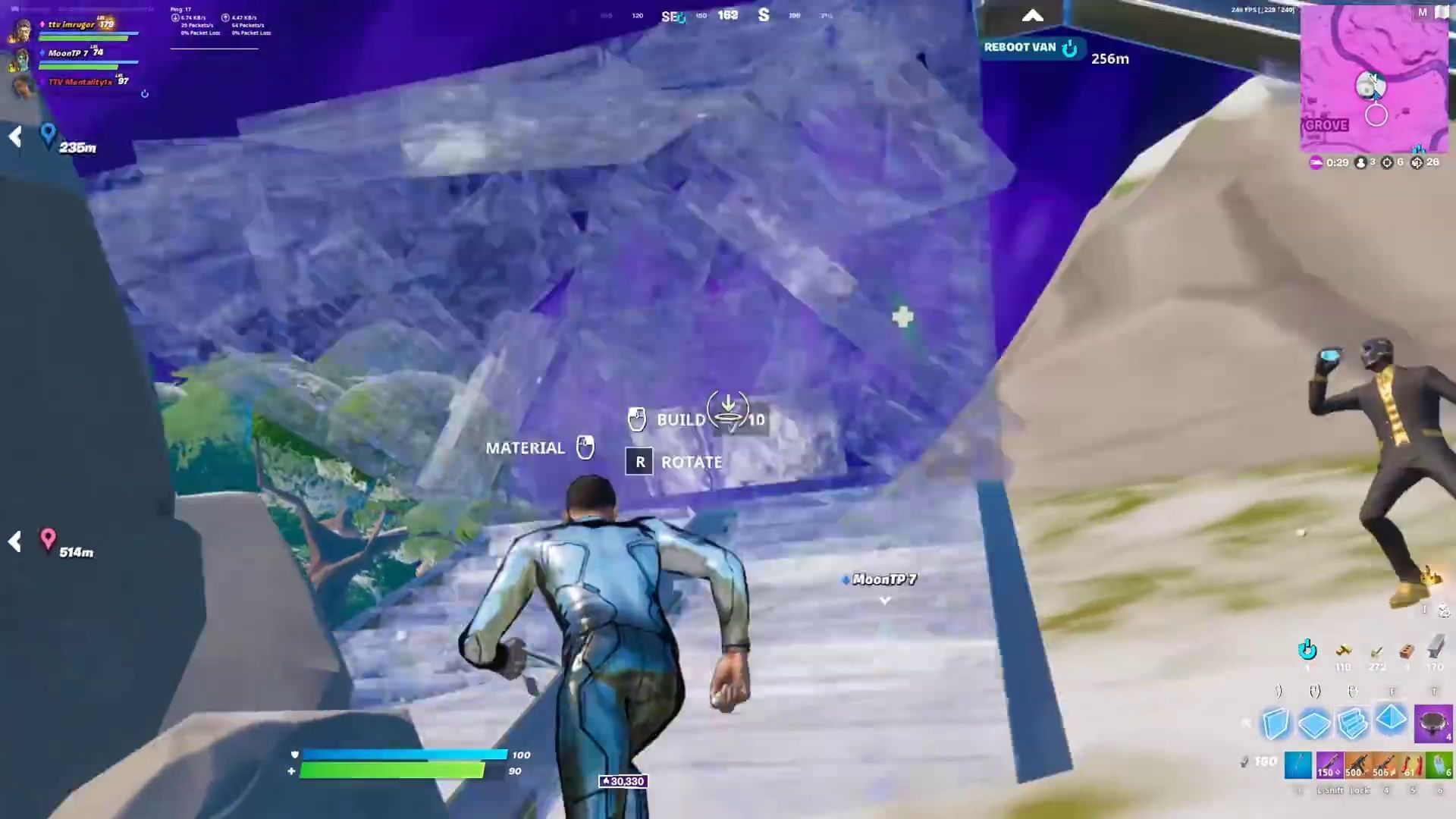 He rushes the player while building towards him using metal pieces and creates a tunneling edit path over a water stream. Rushing his opponent, the player boasts about his Iron Man skin and is ready to clutch the win.