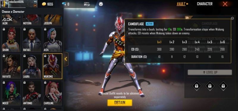 For example, the Camouflage ability of Wukong turns the character into a bush that lasts for 10 seconds which further decreases as soon as Wukong attacks the opponent. Camouflage has a CD time of 300 seconds which resets after each enemy takedown.