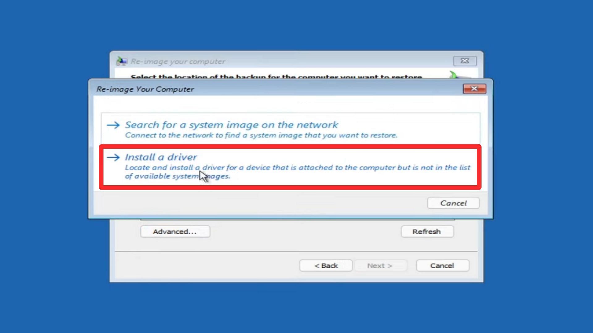 Now, click on Cancel when an error message appears, then select Next. On the next menu, hit Advanced and choose Install a Driver.