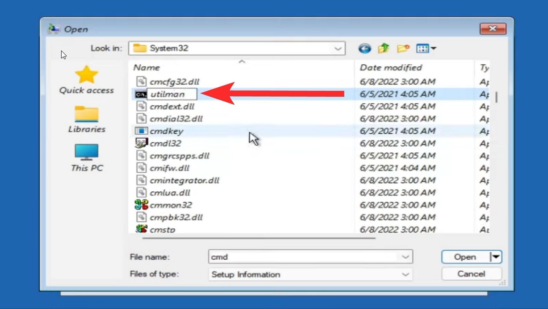 In the same location (System32), locate "cmd" and rename it to "Utilman." Then click on Cancel and close everything.