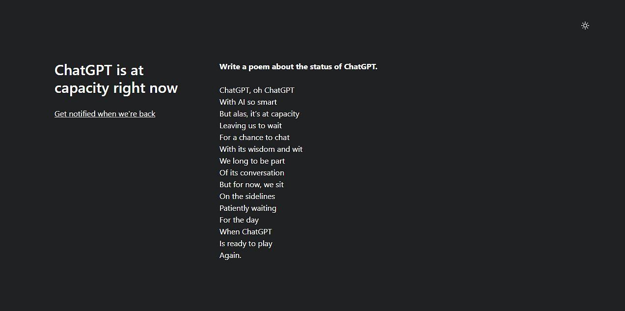 Users trying to access the AI writing system have recently faced issues. Upon navigating to the dashboard, users are greeted with a message stating "ChatGPT is at capacity right now," along with an easter egg that tries to make the most out of the situation. In our case, we got a couple of fun ones. One of the pieces spoke about guided meditation, and the other was a poem on the chatbot.