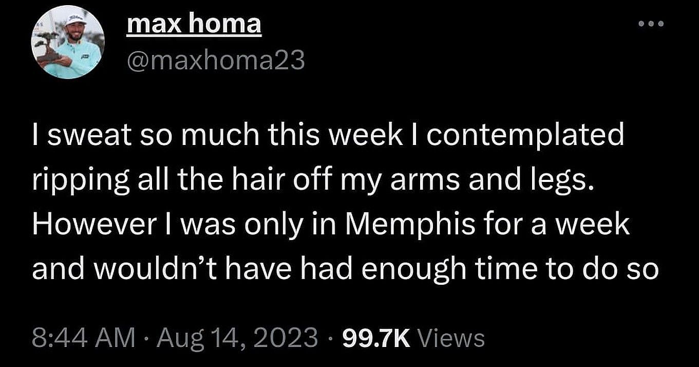 On Monday, Max Homa posted on his Twitter account about his experience playing at the TPC Southwind Golf Course in scorching conditions.