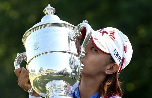 Na Yeon Choi of South Korea kisses the championship trophy after her four-stroke victory at the 2012 US Women’s Open at Blackwolf Run in Kohler, Wisconsin.
