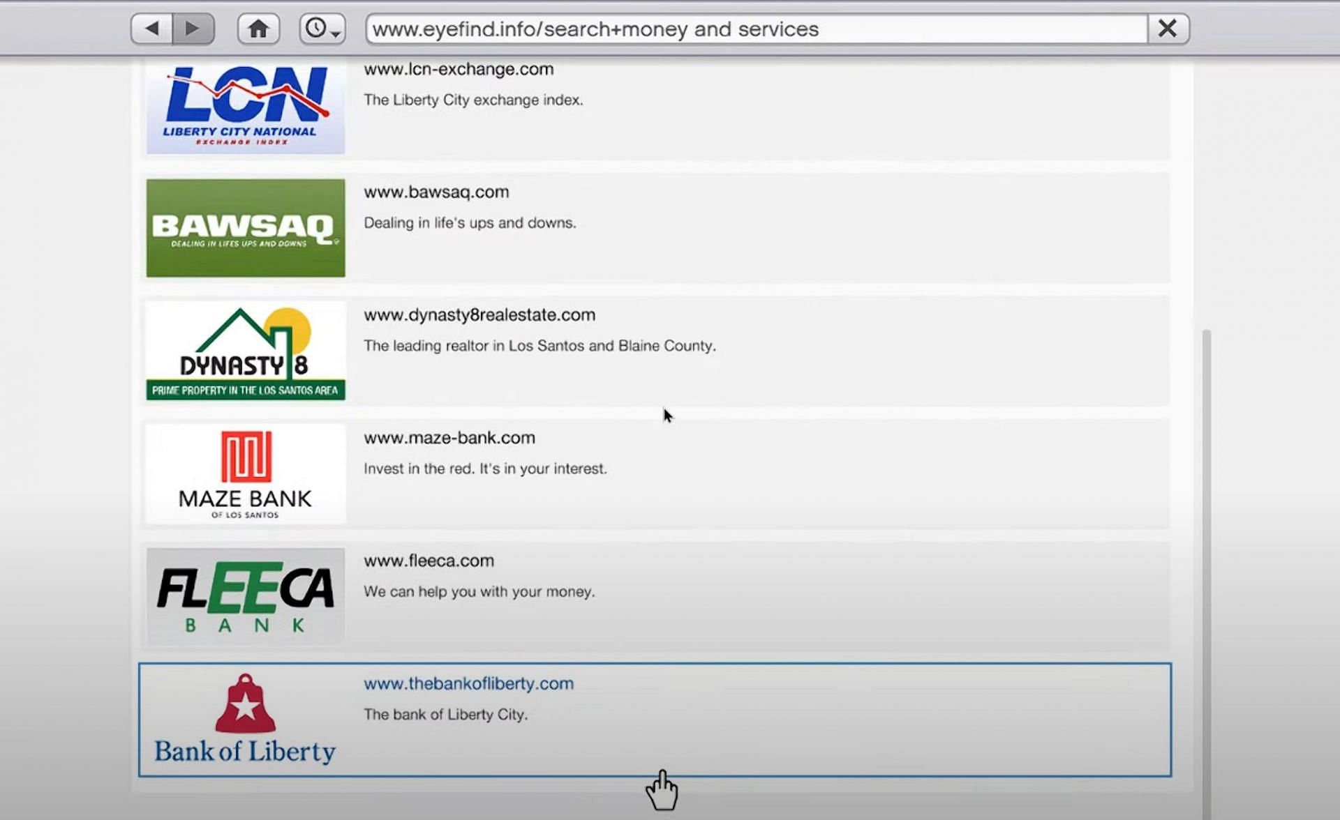 In the current version of this game, gamers cannot visit these websites. That said, they are present in Grand Theft Auto 5, and Trevor Philips can even use The Bank of Liberty for his transaction needs.