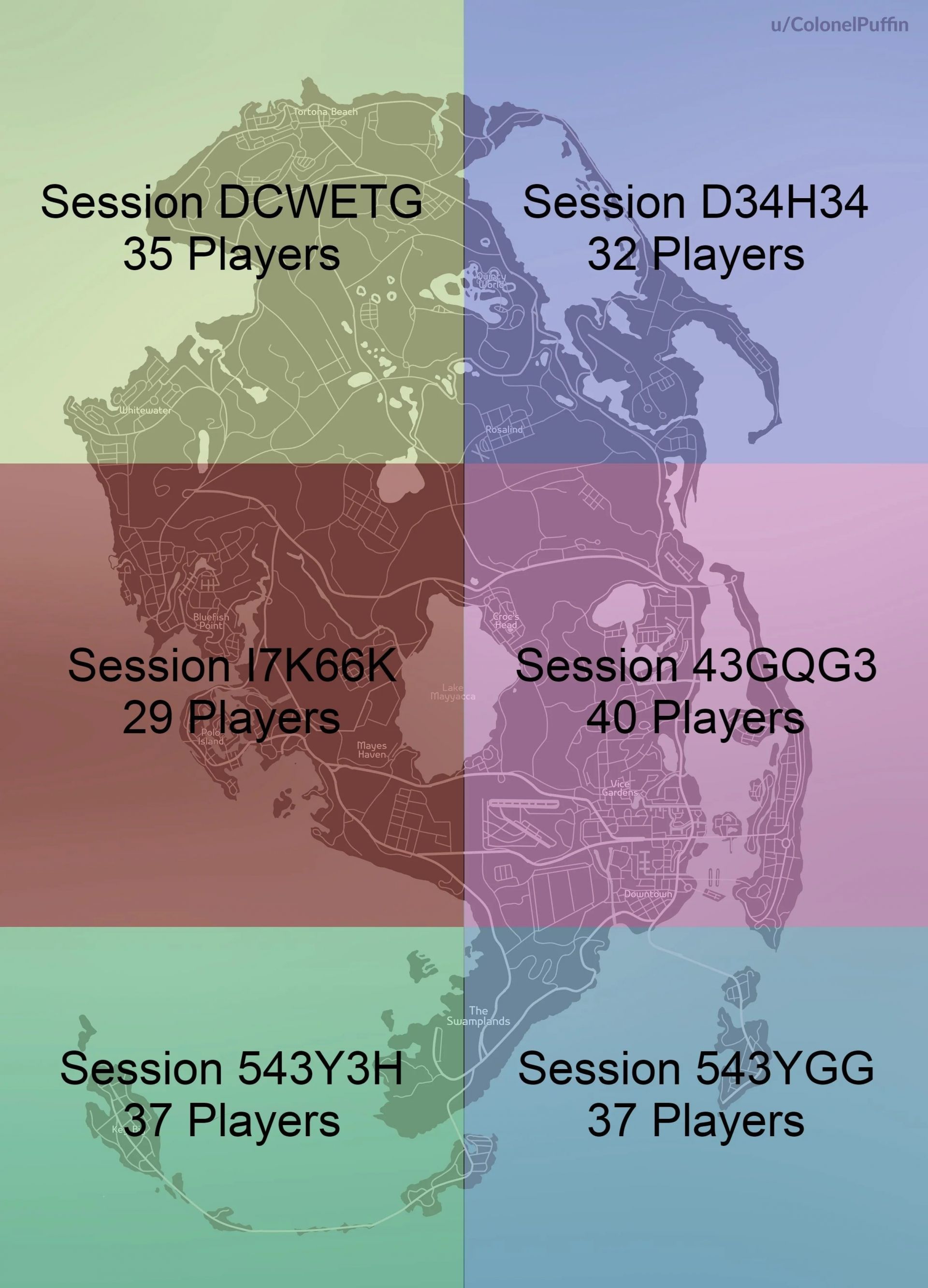Using the above image as a reference, it is easy to understand. Hypothetically, each lobby can hold a maximum of 40 players, and the map is divided into six sessions. The map can be populated by 240 players at a time (40x6). Every gamer can interact with each other just by meeting at a specific location.