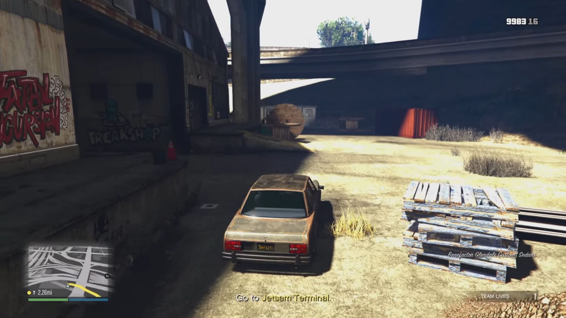 You will receive a call from Dax about picking up a delivery at Jetsam Terminal. This location will be marked on your map, so you shouldn't have difficulty getting to it. You can use any vehicle to get there, although there is a Glendale Custom located nearby for your convenience