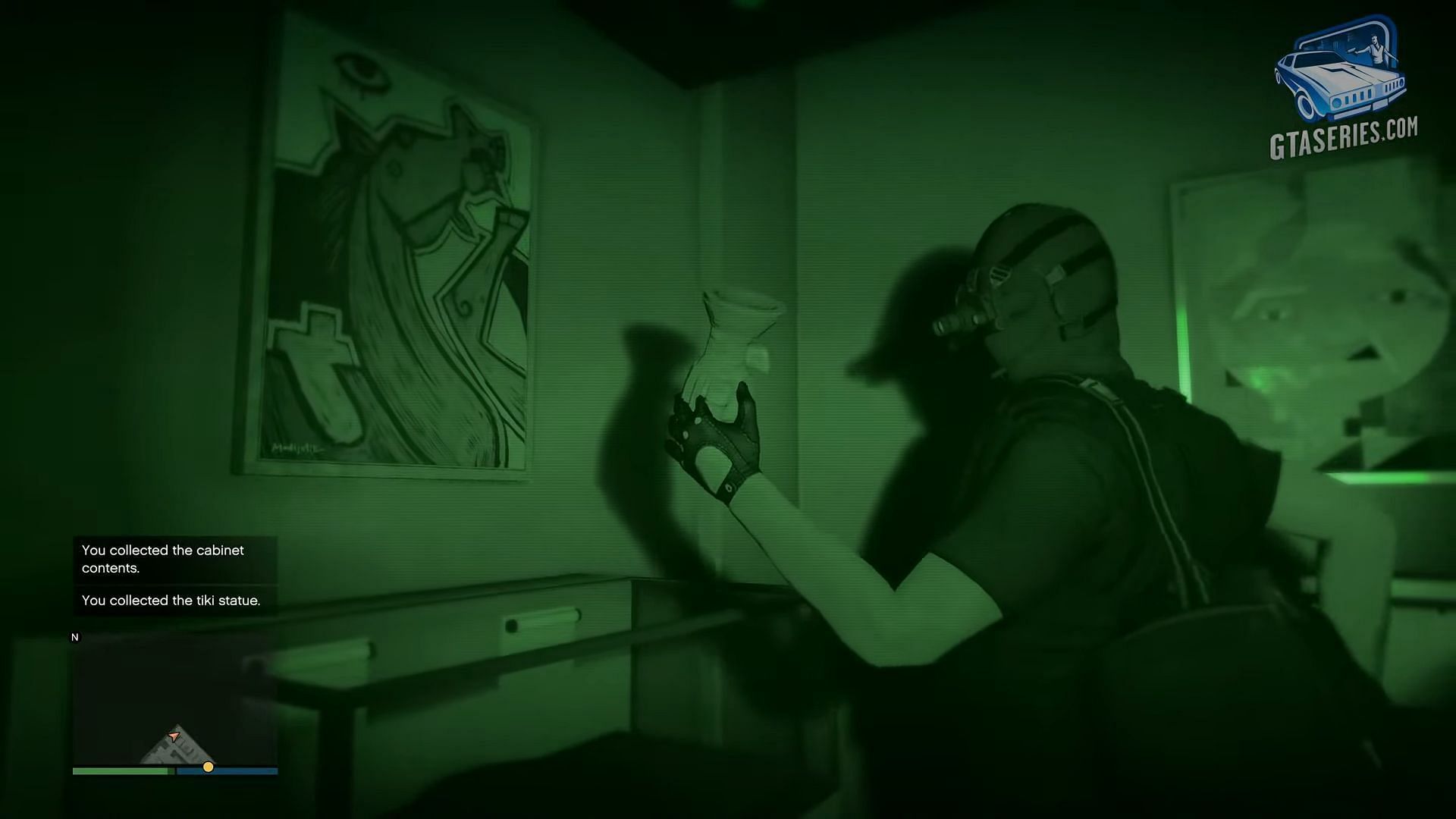 Of course, you should turn on your NVG and look for the vault switch with your signal tracker. Finally, when you're inside the hidden room, break into the vault by passing a simple fingerprint-matching mini-game, like in Cayo Perico. You should pick up all the valuables if you want the bonus payout. You'll discover a cool little Vice City Easter egg when you pick up the tiki statue, so we won't spoil the surprise here.