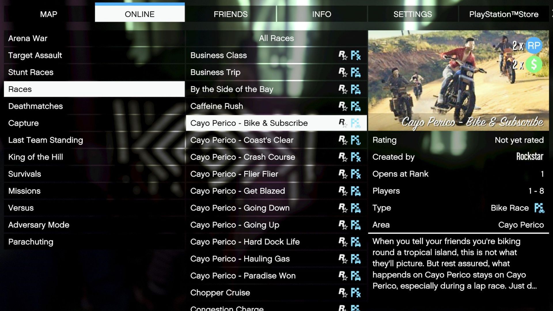 All of those races are available at Rank 1, so there isn't much of an excuse not to do them if one wishes to purchase the Draugur. They can easily be done through the jobs menu, as seen in the above image. If there is a green checkmark next to all ten of those Cayo Perico races, then the player has unlocked the Draugur's Trade Price.