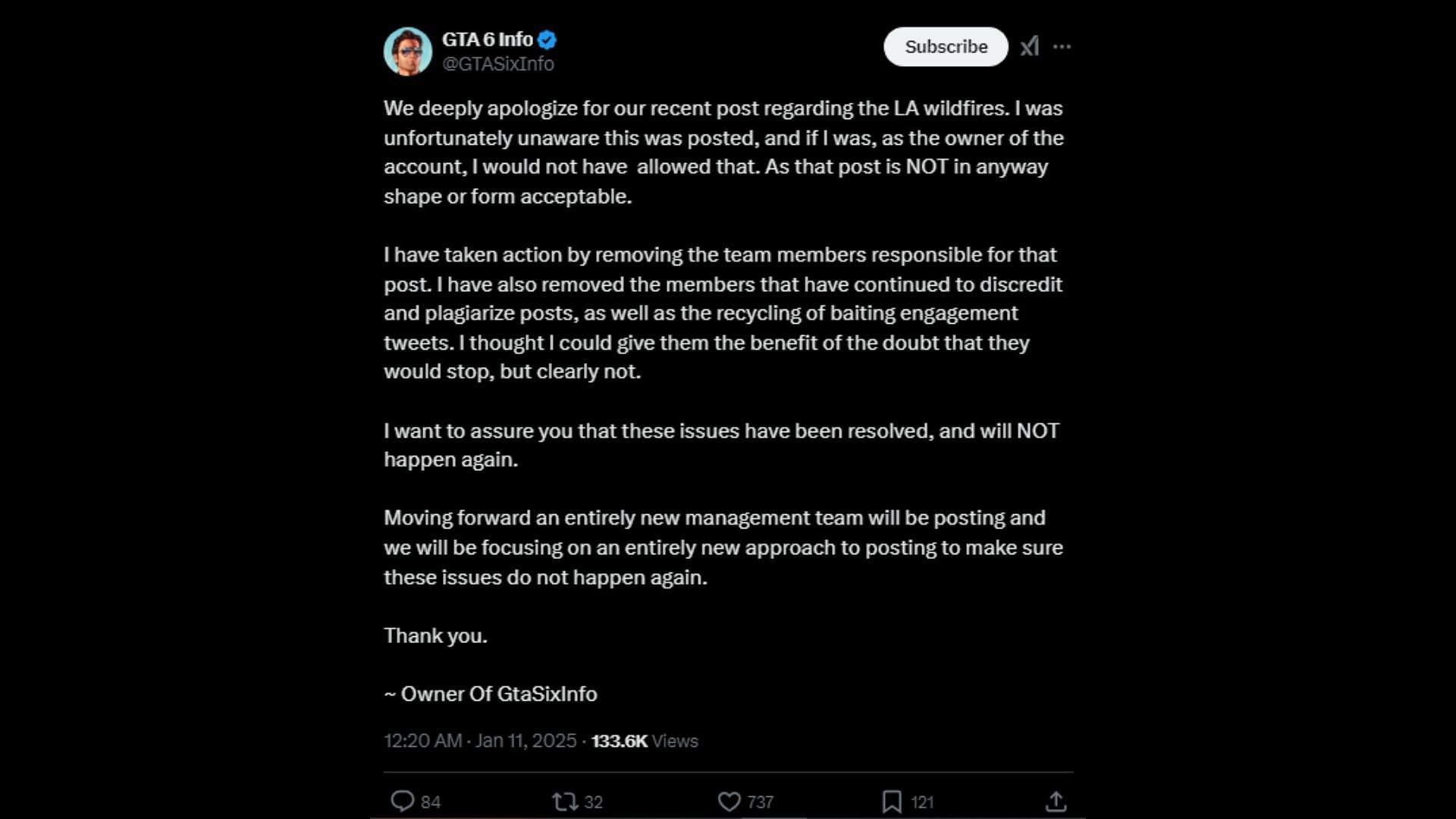 The owner of the X fan account @GTASixInfo stated that they were unaware of the tweet linking the LA Wildfires to Rockstar Games, and would not have allowed such a thing to be posted. As mentioned earlier, they have also stated that the team members responsible for the same have been removed. The apology tweet further stated that an entirely new management team will be posting from now onwards.