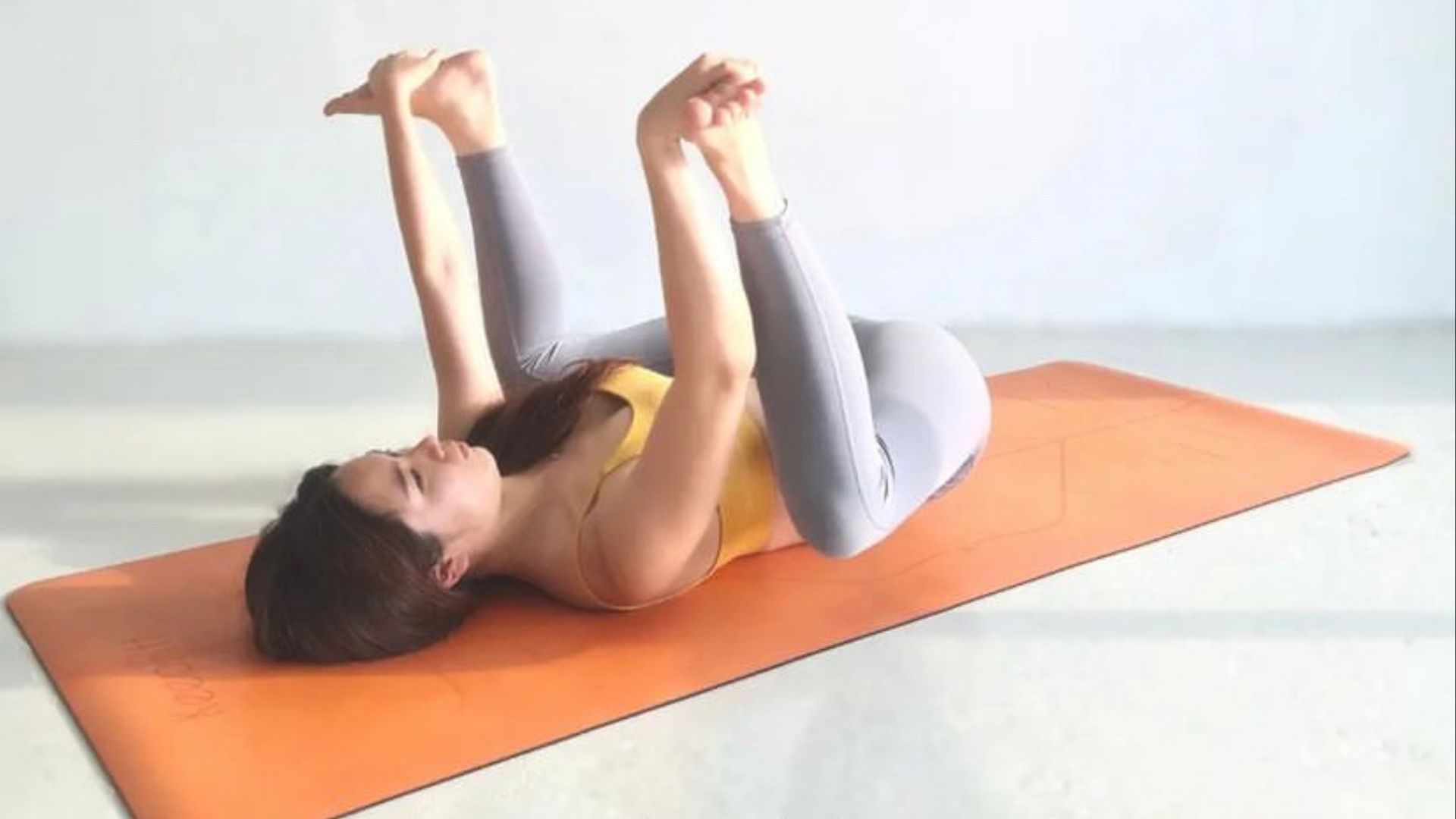 - Once you’ve grabbed your feet, rock your body from side to side and keep on breathing deeply.