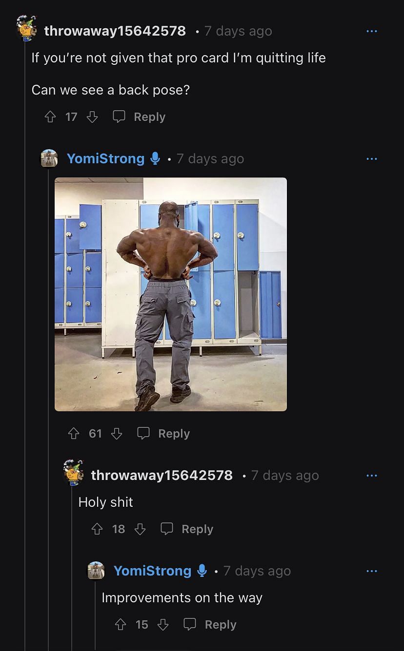 The same Reddit user asked Olajide for a photo of his back, and the young bodybuilder uploaded the same.