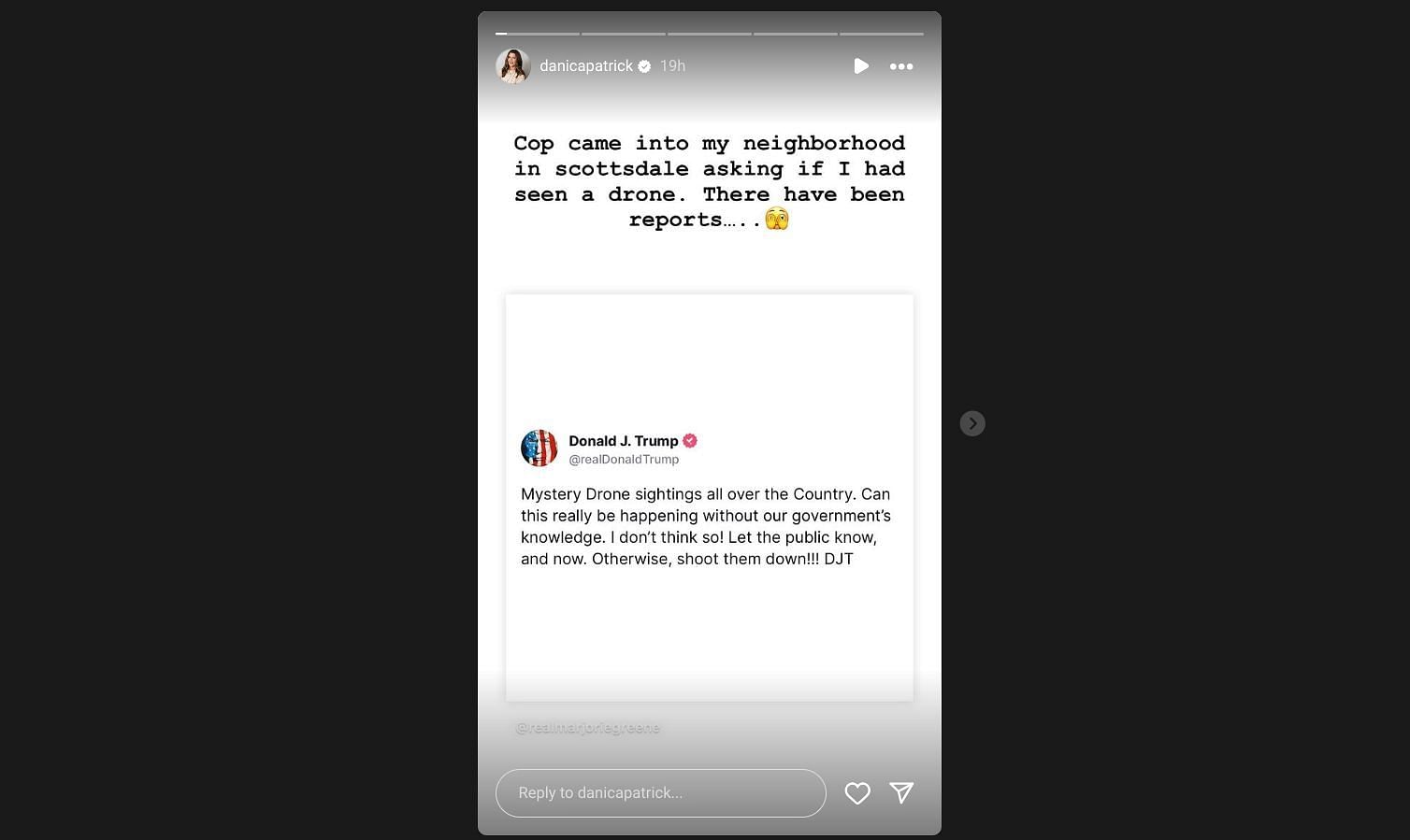 Danica Patrick reacts to Donald Trump’s post about drone sighting in New Jersey