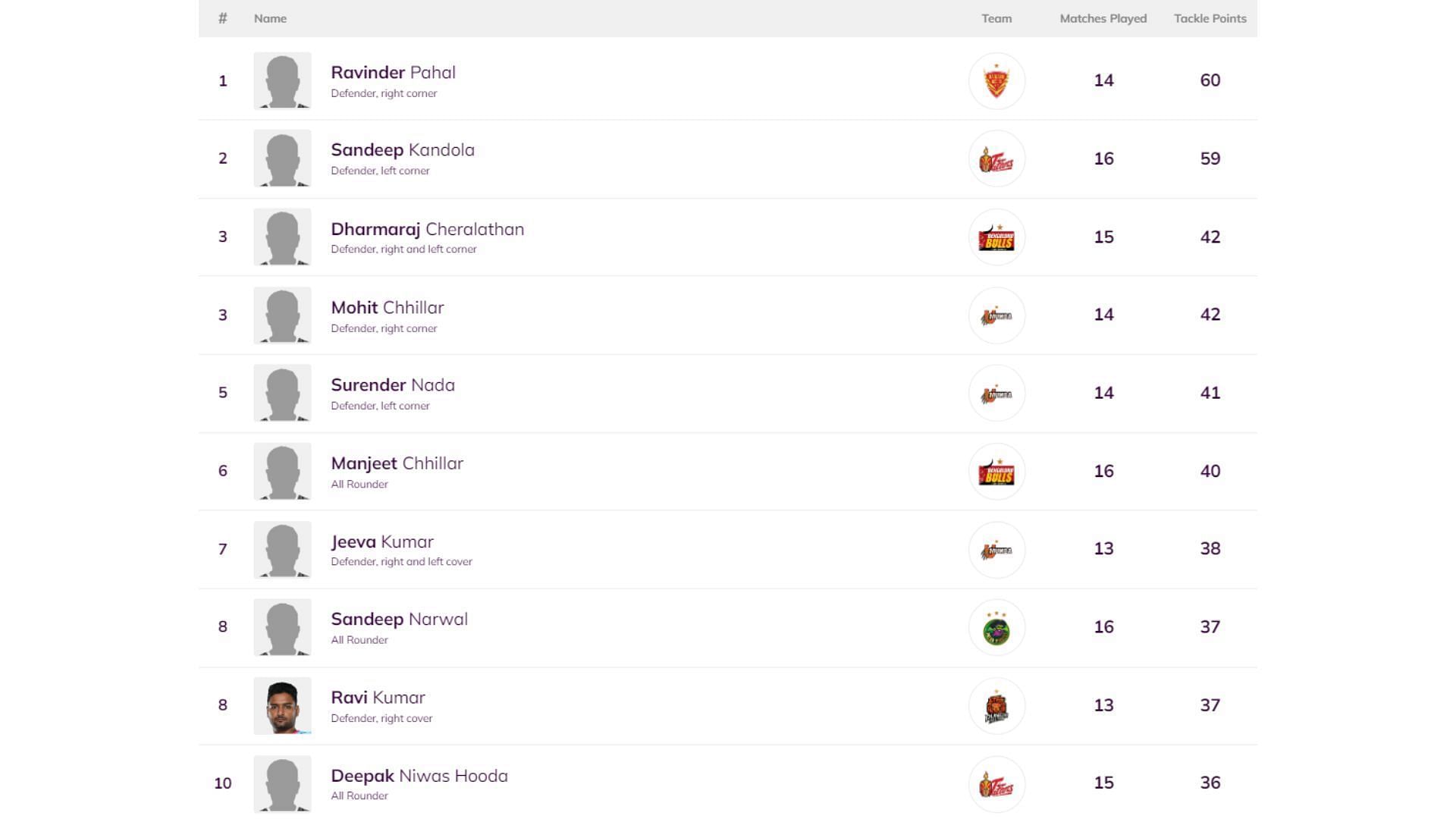 Meanwhile, Sandeep Narwal and Ravi Kumar both finished joint eighth with 37 tackle points. Deepak Niwas Hooda, another standout performer, completed the top 10 with 36 tackle points.