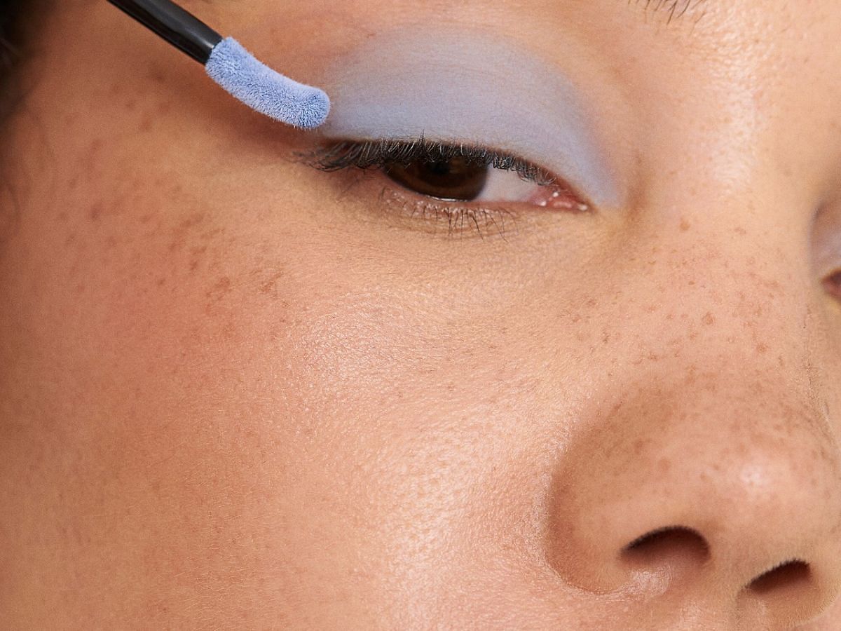 - Once applied, blend the shade onto the lids with gentle sweeping strokes with the fingertips or a small eye shadow brush.