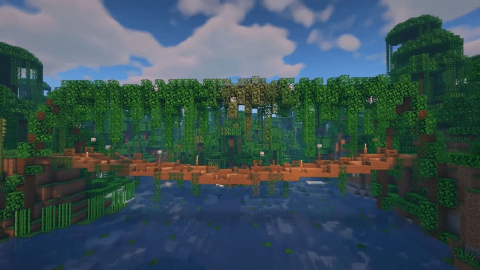 Constructed primarily with jungle wood, it possesses arches at opposite sides of the bridge, and the bridge itself bends down towards the center to appear as if it's swaying like a rope bridge. A massive helping of vines and leaf blocks ensures that it blends in perfectly with the jungle overgrowth.