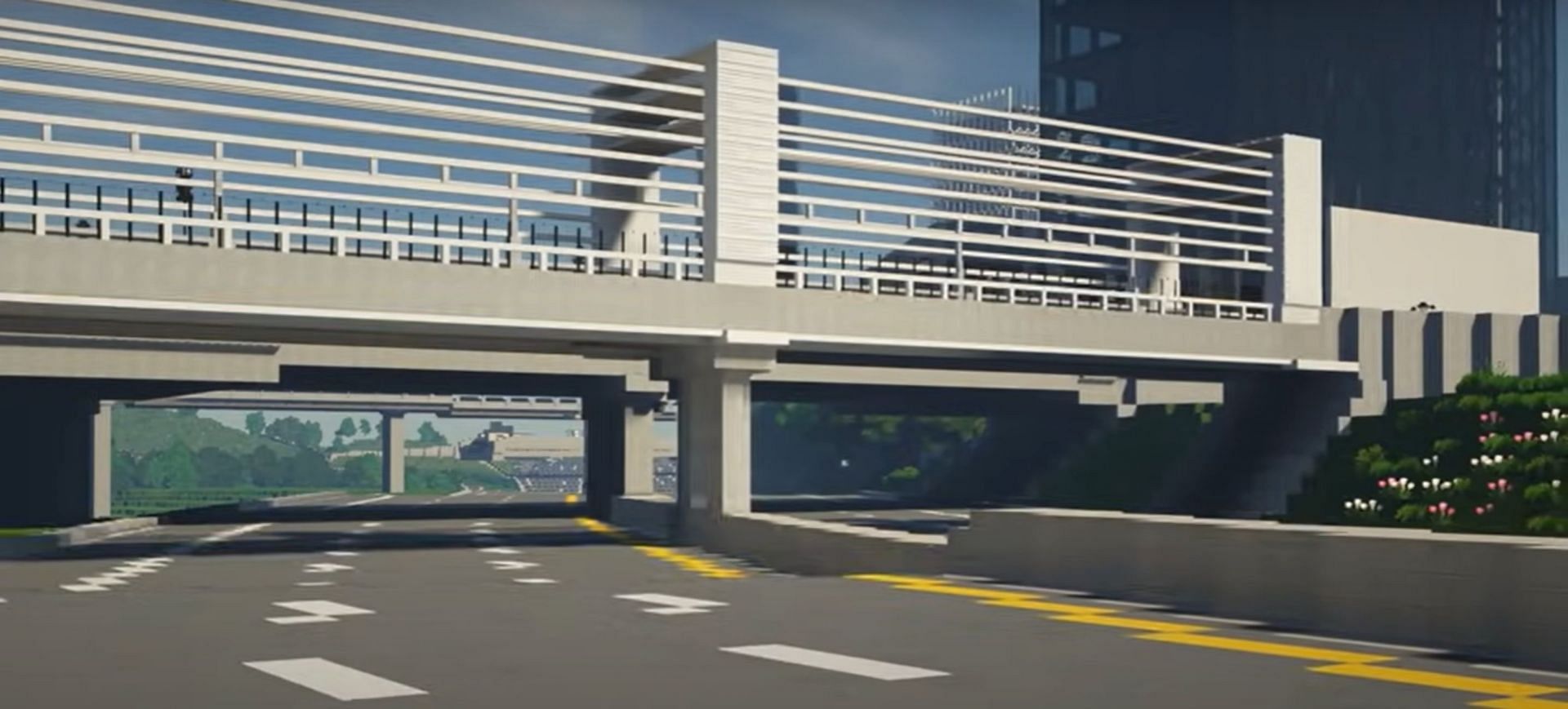 Utilizing real-world civil engineering techniques, this bridge is a Minecraft marvel that could also be applied to real-world bridge building. It is minimalistic, clean, and modern all at once and uses quite a significant amount of concrete blocks to keep it upright.