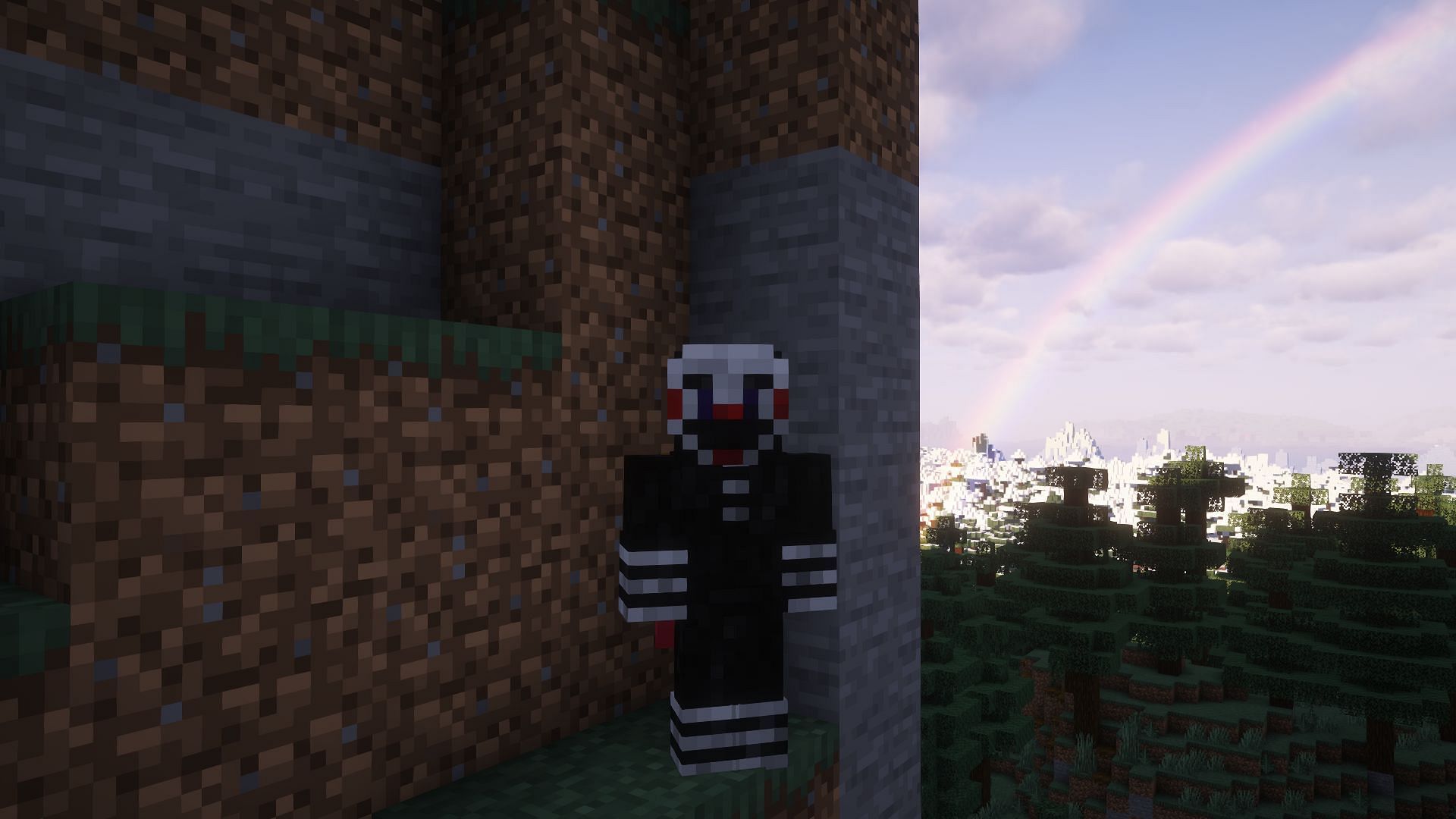 This particular Marionette skin features a striking rendition of the animatronic's mask. The reds and purples used here are very saturated, more so than Minecraft's dyes. These areas of color also pop quite well due to the rest of the skin's subdued nature. The base of the skin isn't bland though, as it features a nice gradient of dark grey shades.