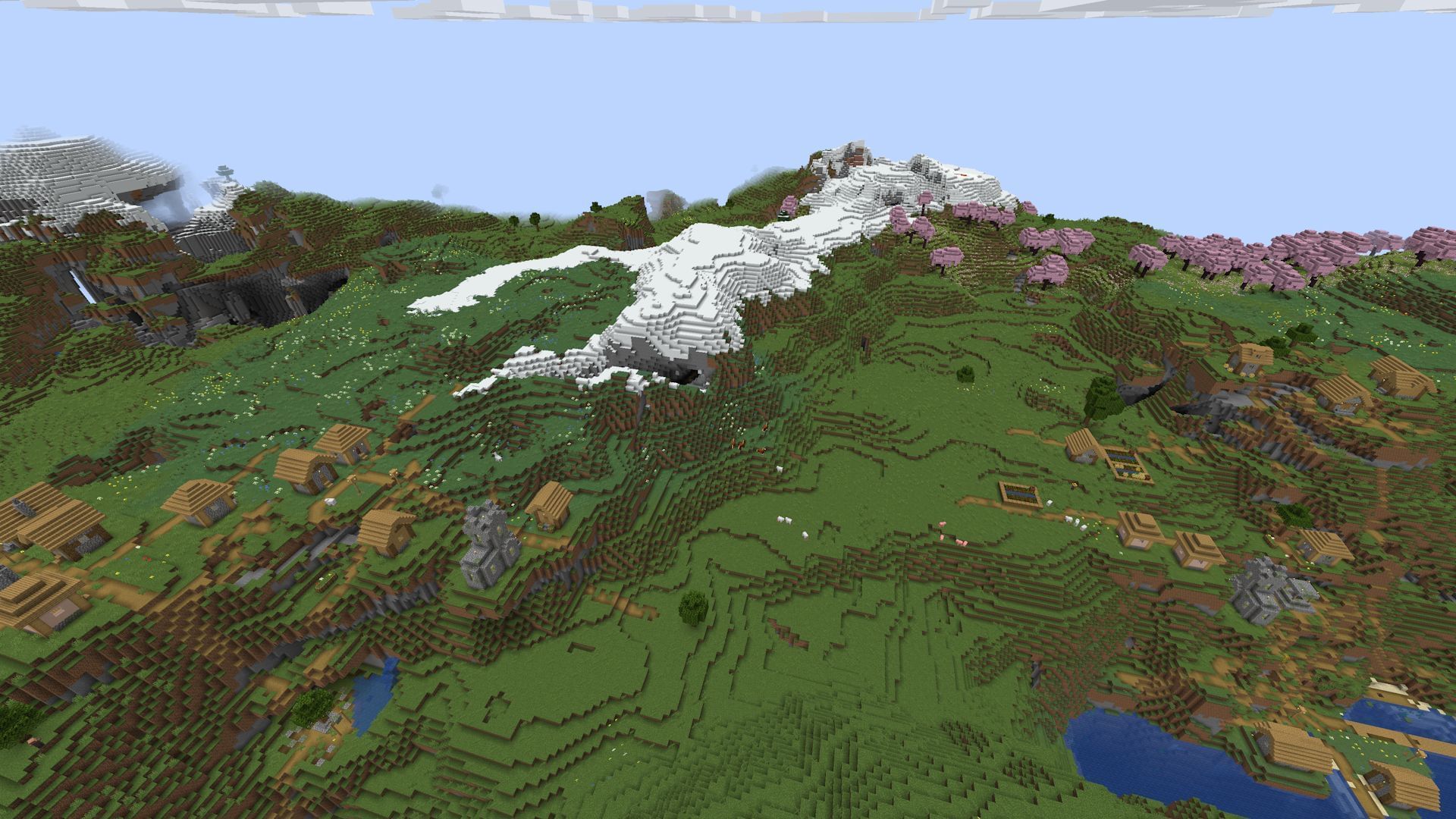Players using this seed will spawn in the plains biome, surrounded by four villages. The village to the southwest is located in a cherry grove, meaning players can access the best wood from the start. There are more villages and a pillager outpost to the south, while to the north, there is a small ocean. At the center of this inland sea, players will find an ocean monument perfect for farming Minecraft's guardian mob.