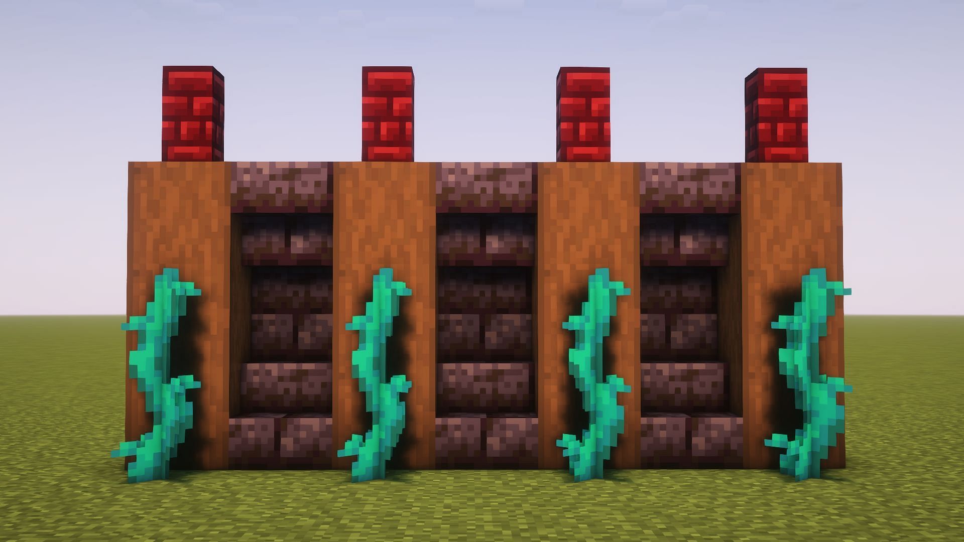 This particular wall has a combination of Overworld and Nether blocks. It also has a dark and eerie look, which can work with some builds and bases. It consists of spruce-strip wood logs, blackstone bricks, blackstone brick stairs, red nether brick walls, and warped vines.