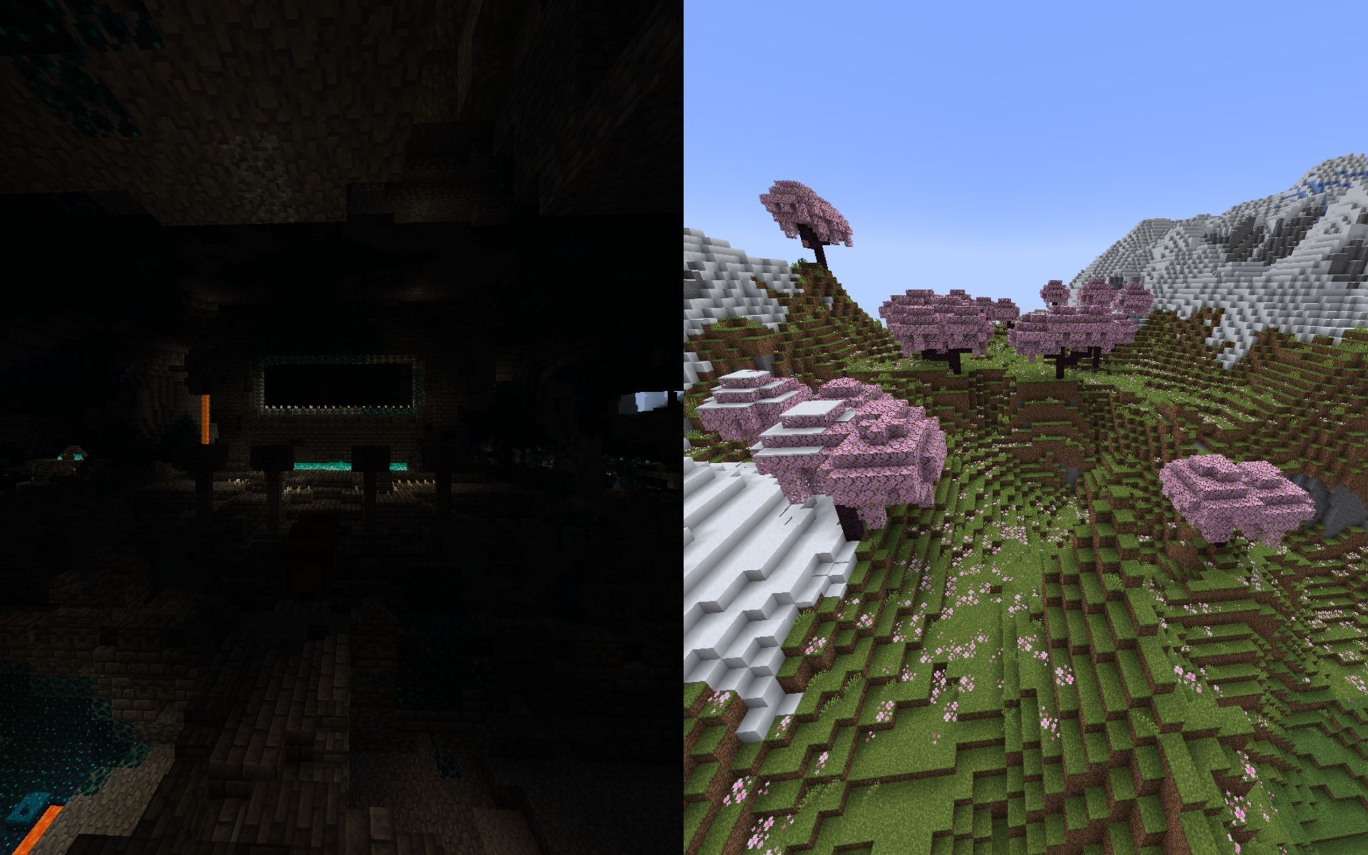 The biome sits on a low hill with snowy slopes biomes beside the two stretches of cherry groves. Another small cherry forest can be found around 500 blocks south of the spawn location. Players are encouraged to use shaders and resource packs when playing on this seed if their system can run the game with them.