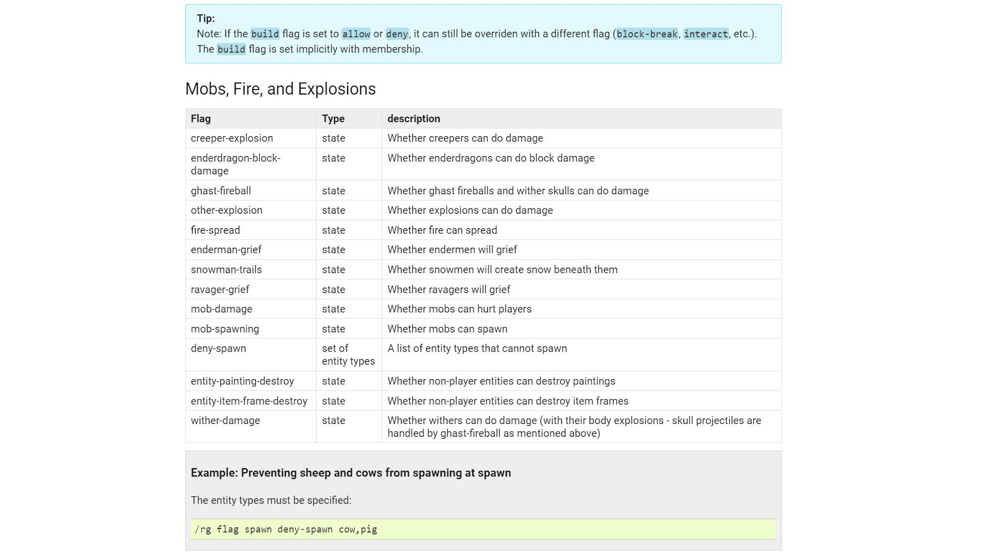 This game has a ton of optional flags that can be applied to a saved region to further customize exactly what can happen within this area. These flags include whether specific types of mobs can do damage to blocks, which is useful for avoiding enderman and creeper griefing.