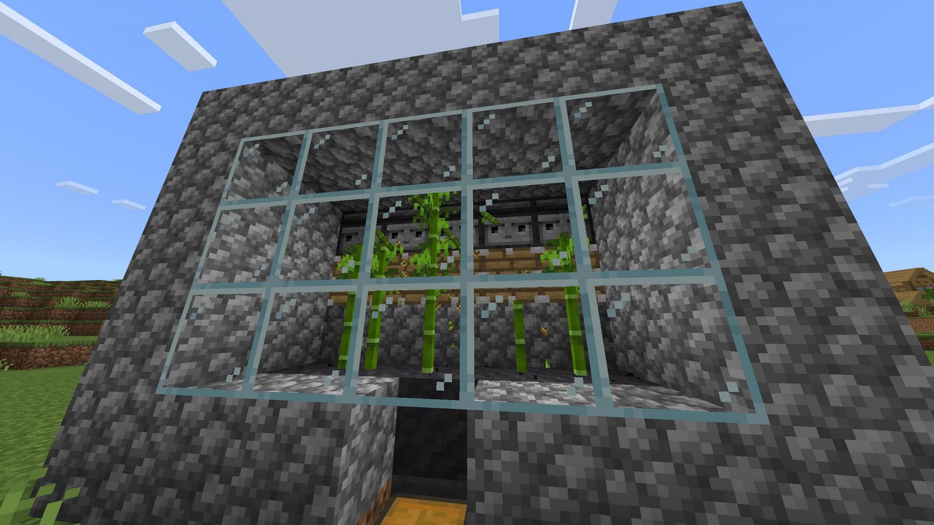 Finally, you can finish the farm by covering all open areas with building blocks, and the front of the farm with glass so that you can see it in action. All areas must be covered to ensure that the broken bamboo items only fall on the mud block so that they can be sucked into the hopper.