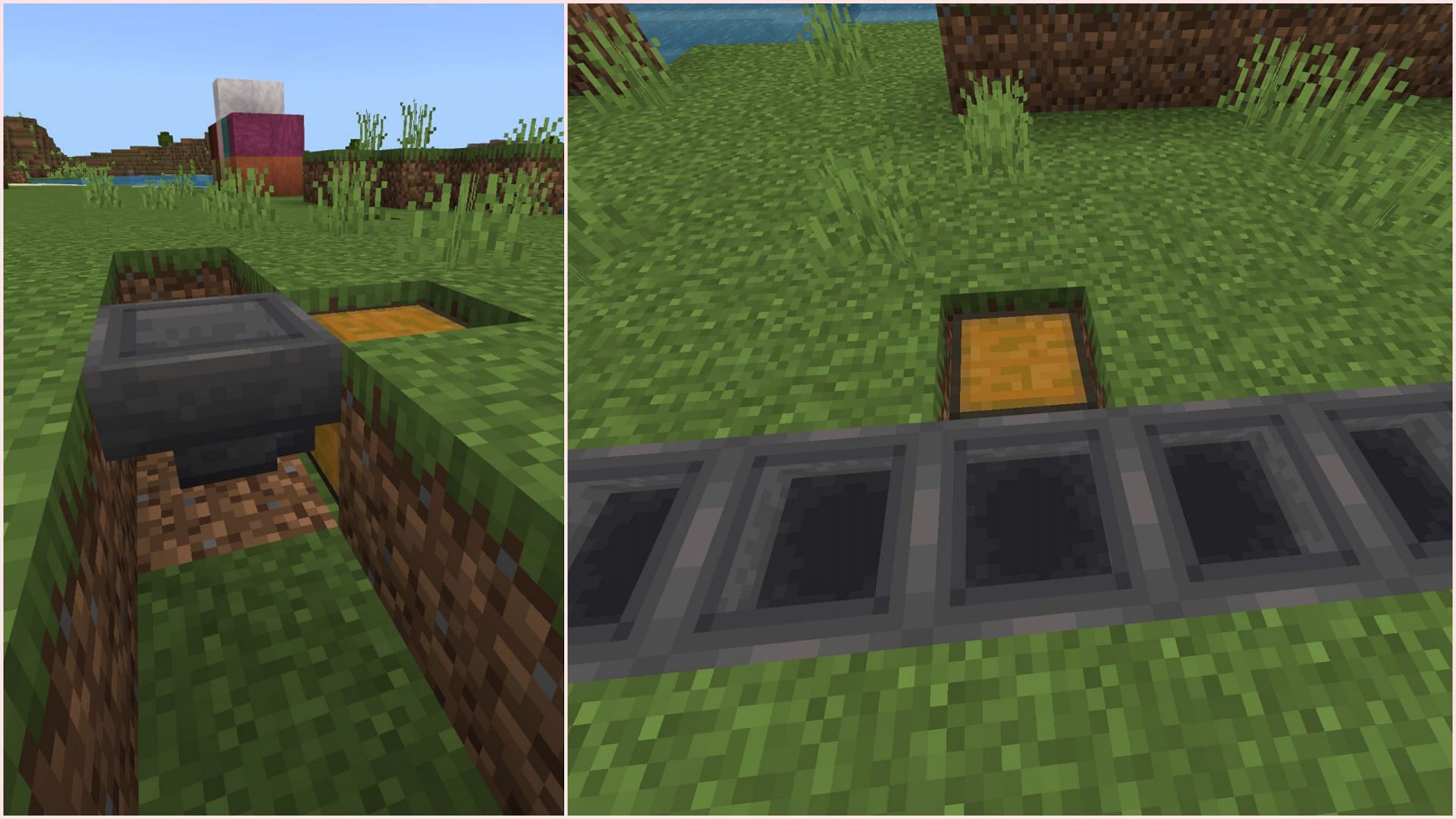 After gathering the resources, start by creating a five-block-long trench and a single hole beside it in the middle as shown in the pictures. Place one chest in the hole, and connect it with the first hopper placed in the middle of the trench. Then place other hoppers that connect to the first hopper. These hoppers will essentially take all the bamboo and store them in the chest.